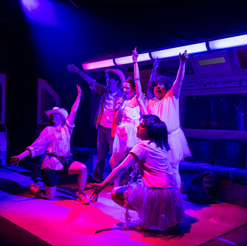 Liam Horrigan earns perhaps some of the largest laughs, some before the show even begins as he guides people into the performance space as a TFL worker, dons a giant top hat to play a Victorian railroad manager, mourns the loss of paper tickets as an enthusiastic inspector and joins in with an hilarious hen do scene.
