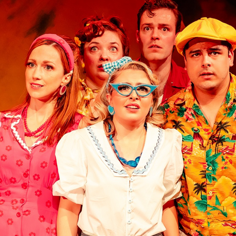 This ensemble piece, with its 90 minute running time, is crammed full of laugh out loud moments (some of which even have the on stage band in fits of giggles) recurring jokes and high energy dance numbers, and whilst the fourth wall is never quite completely shattered, there are a fair few knowing looks to the audience that really bring the punch lines home. The original songs by Brandon Lambert take heavy inspiration from a number of 50's hits, to the extent that audience laughter rises from the realisation of what song is being referenced. For example, 'Who Put The Bomp' becomes the title song 'Beach Romp Bomp A Lomp' , 'Big Girls Don't Cry' becomes 'Mature Women Don't Whine', 'Lollipop' becomes 'Popsicle' and 'Locomotion' becomes the 'Ocean Motion' to name but a few. It's very silly, but incredibly entertaining throughout, and the cast which is completed by Dixie Newman and Bradley Adams, perform each number with impressive vocals with a wonderful sense of fun.